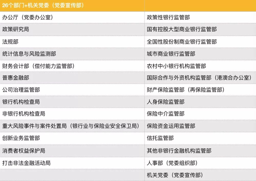 根據“三定”方案,銀保監會有26個内設部門(mén),另設機(jī)關黨委(黨委宣傳部):